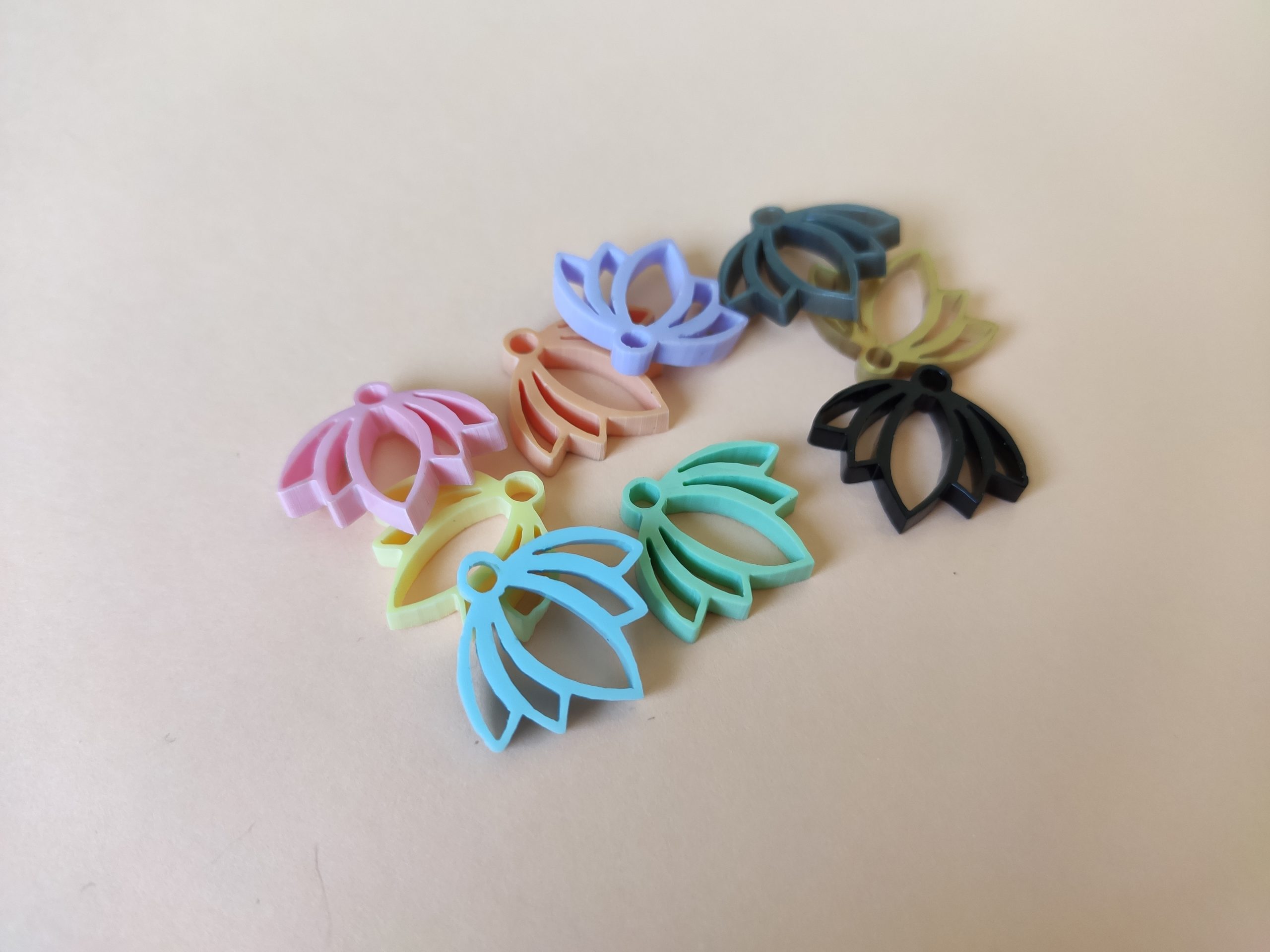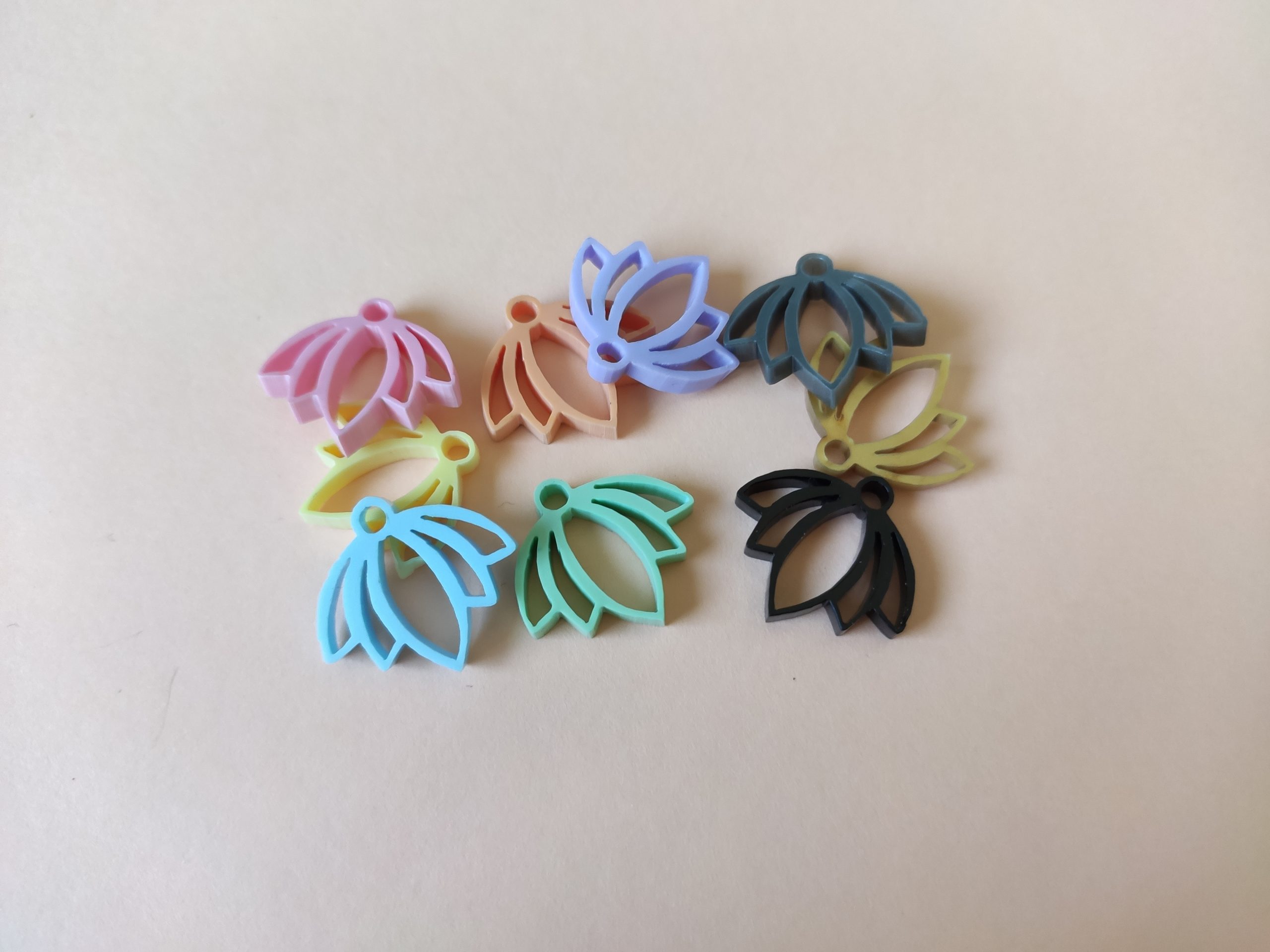 Flores de lotto de metacrilato en varios colores pastel, negro, plata y oro.