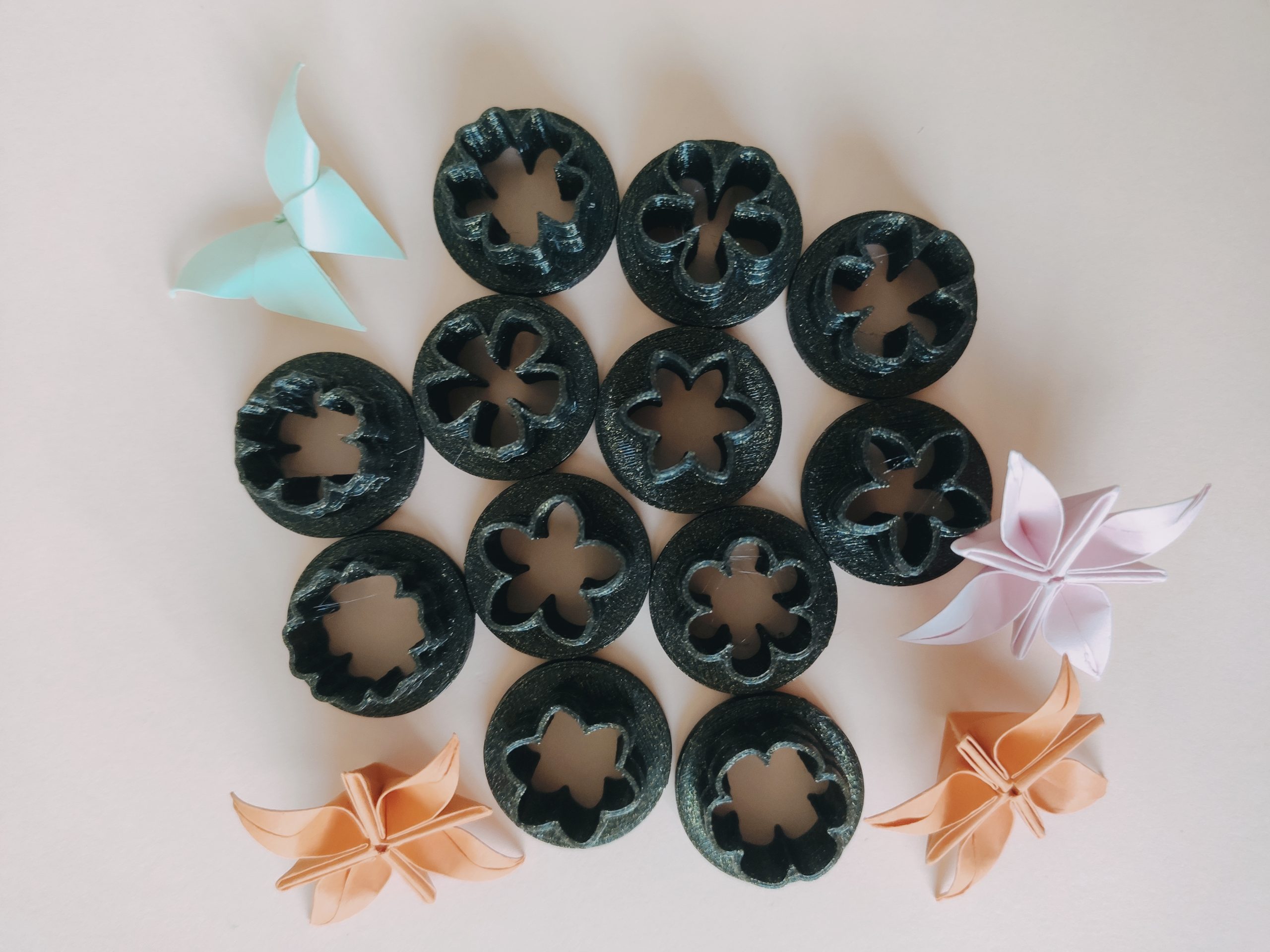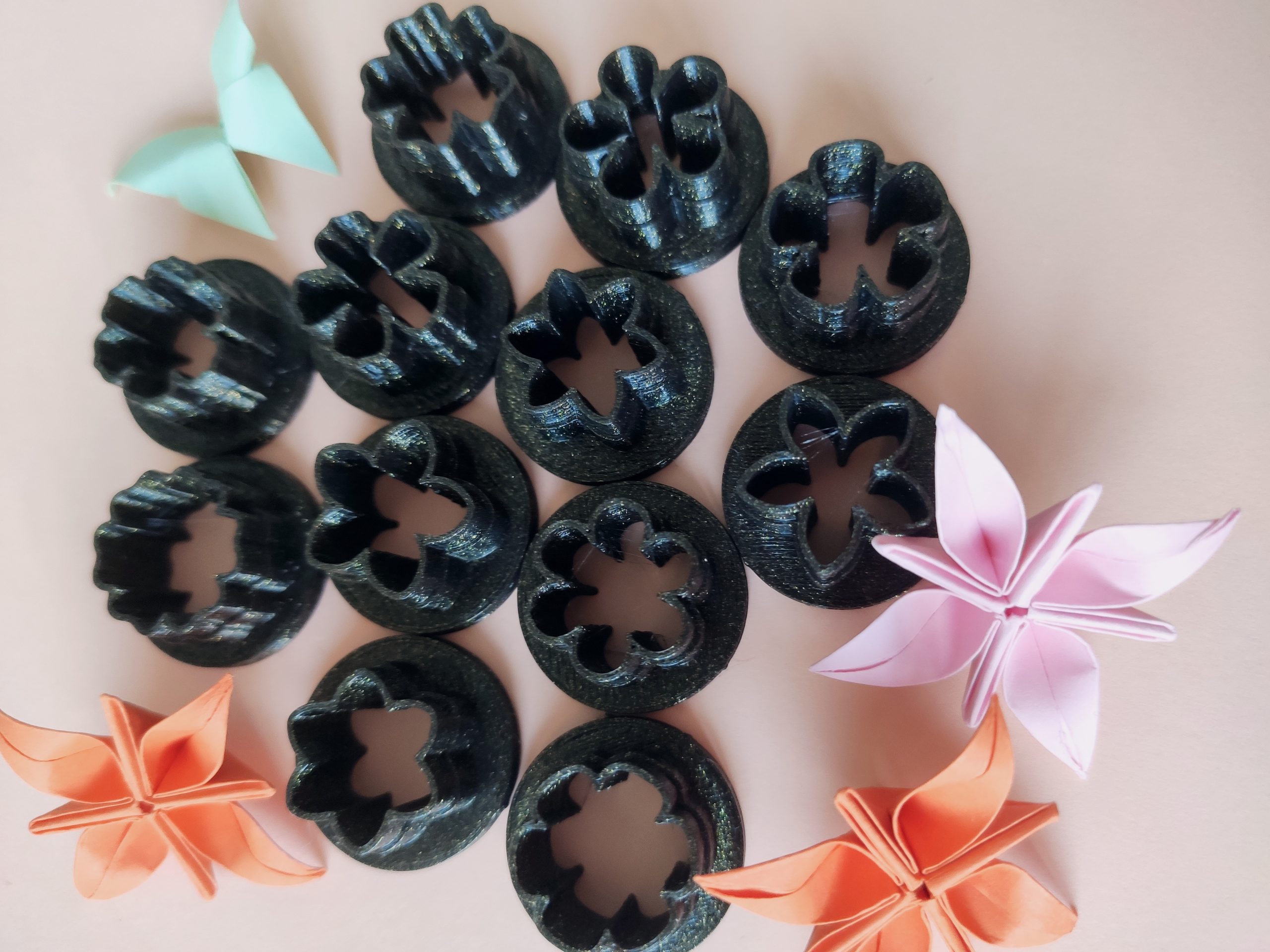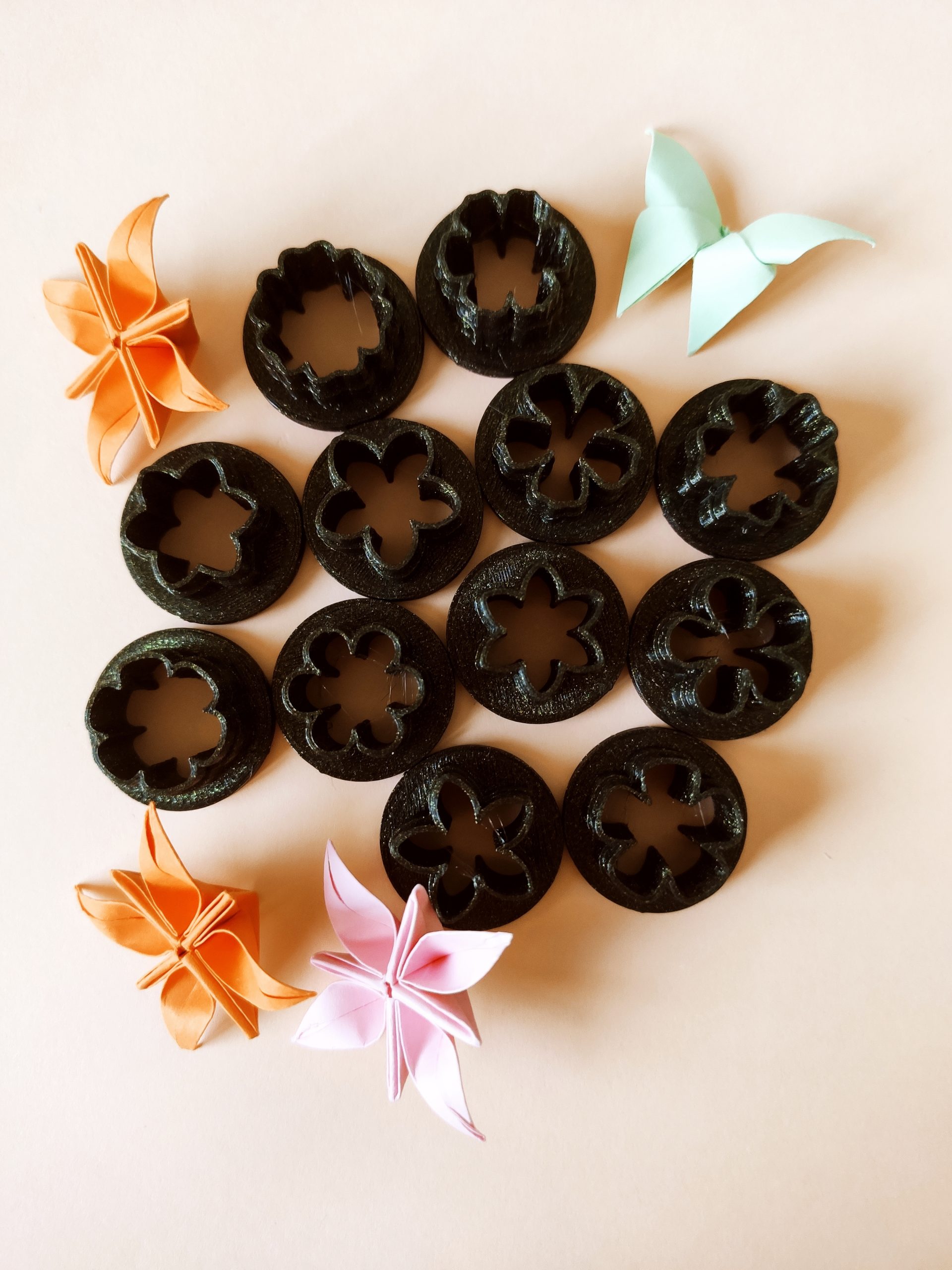 Pack de cortadores de arcilla polimérica en forma de florecillas – todas distintas entre sí. Impreso en 3D. El color puede variar. Cada flor mide aproximadamente 1 cm.